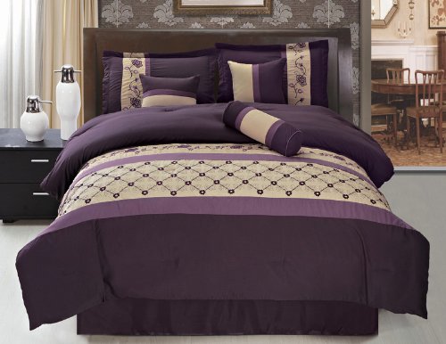 7Pcs King Purple and Beige Embroidered Comforter Bedding Set