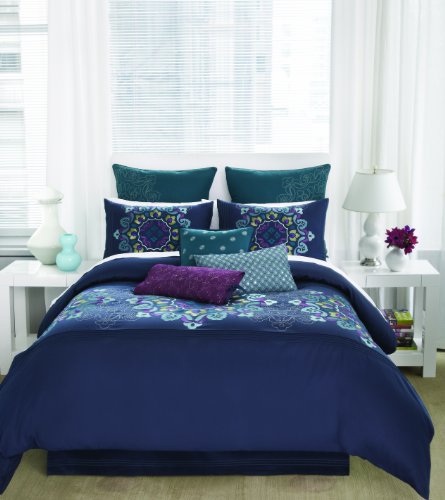Bright, bold and spirited. bianca has an engineered suzanni design embroidered horizontally on the bed with pleating details and on the comforter and matching standard shams. colored in rich jewel tones with hints of turquoise. the entire bed has a mixture of embroidery techniques. euro shams have the suzanni design asymmetrically placed. decorative pillows add hints of bright colors with embroideries and tie closures.